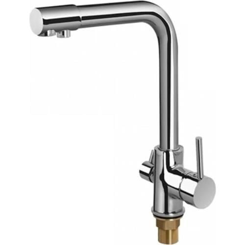 Krom kaplı pirinç gövde, 35'lık kartuş, zamak kumanda kolu, su arıtma musluklu evye bataryası, çelik bağlantı hortumu, tezgah üstü montaj