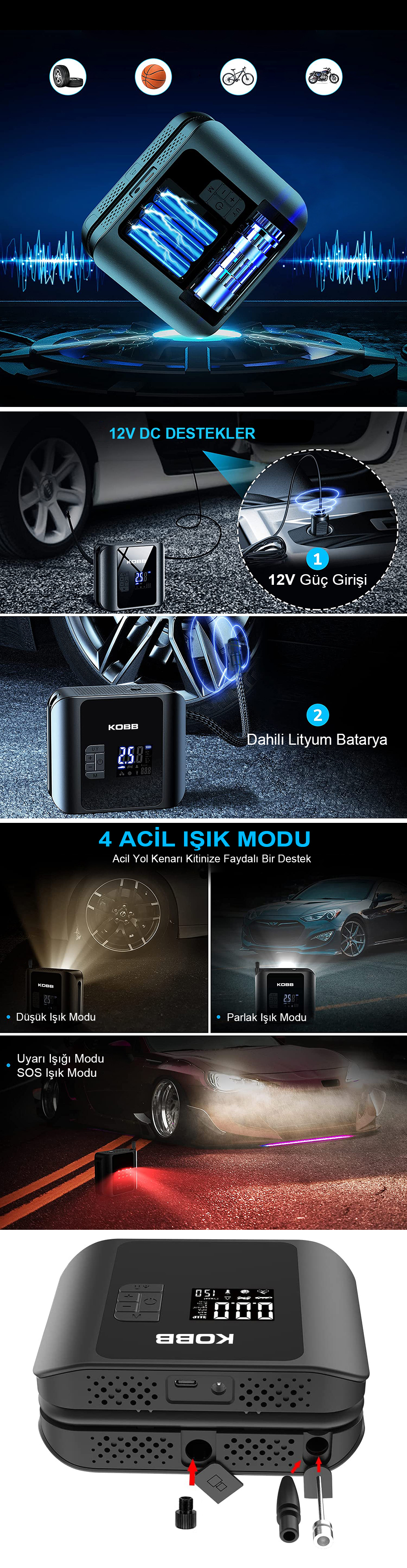 · KOBB KB420 12Volt / Şarjlı Li-ion 150 PSI Taşınabilir Dijital Basınç Göstergeli Led Aydınlatmalı Akıllı Lastik Şişirme Pompası + SOS
