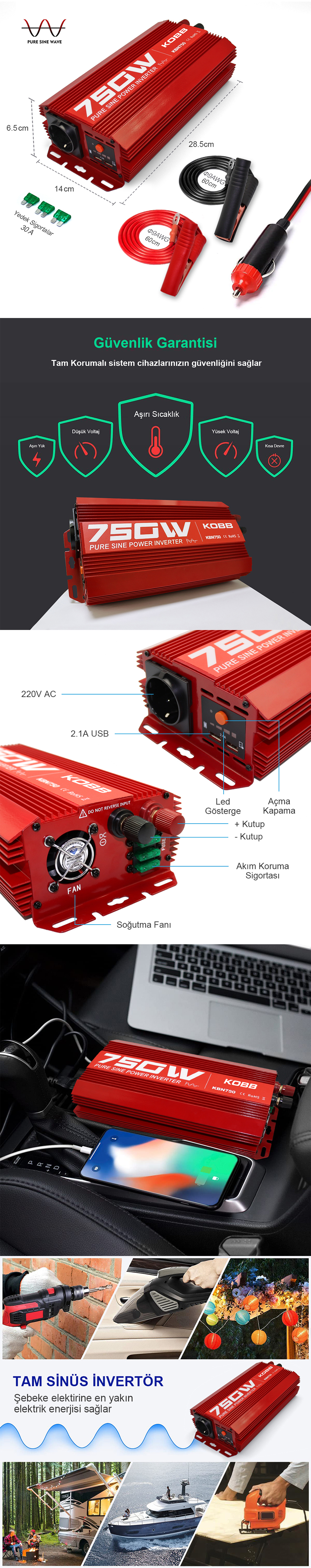 · KOBB KBN750 12V/220V 750Watt Tam Sinüs Dönüştürücü İnvertör