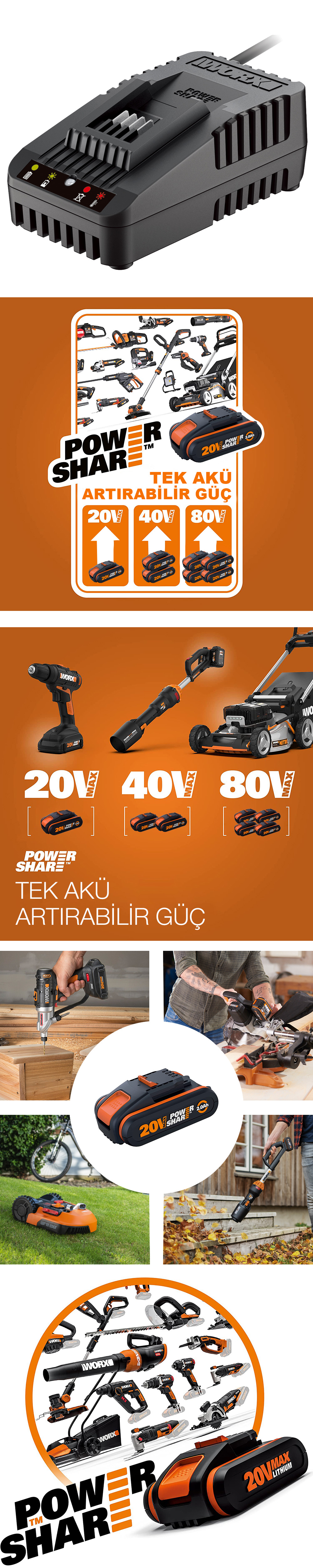 ·         Worx 20Volt Li-ion PowerShare Aküler ile uyumlu akü şarj aleti amper değeri gözetmeksizin 20Volt akülerinizi şarj eder.