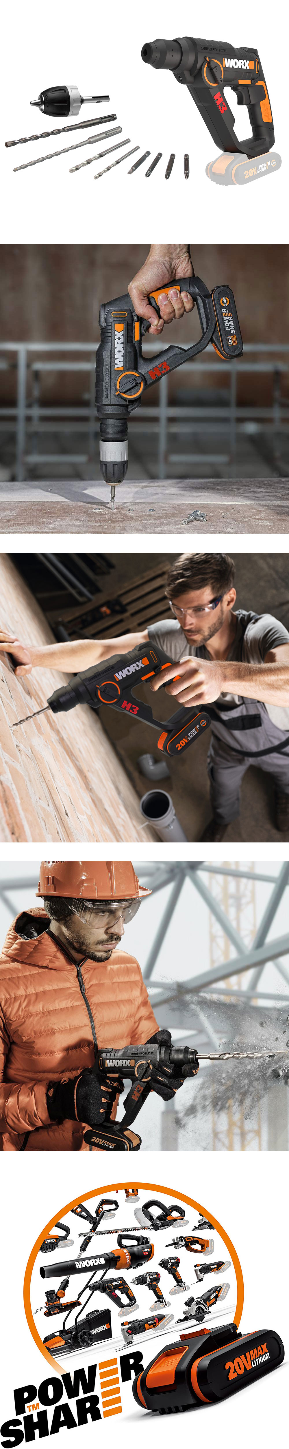 ·WORX WX390.9 20Volt 1.2J Profesyonel SDS-Plus Pnömatik Şarjlı Matkap + 8 Adet Uç + Mandren (Akü Dahil Değildir)