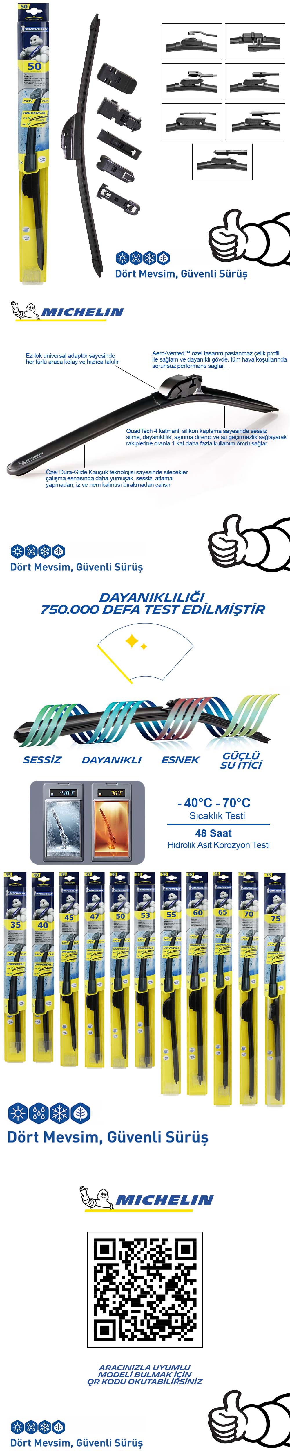 · Doğru ölçüdeki Michelin sileceği almak için görselde belirtilen QR kodu akıllı telefonunuzun kamerası ile okutarak açılan uygulama ekranında aracınızın Marka, Model ve üretim yılını seçerek hem sürücü tarafına hem de yolcu tarafına uyumlu silecek model ve ölçüsünü tesit edebilirsiniz.