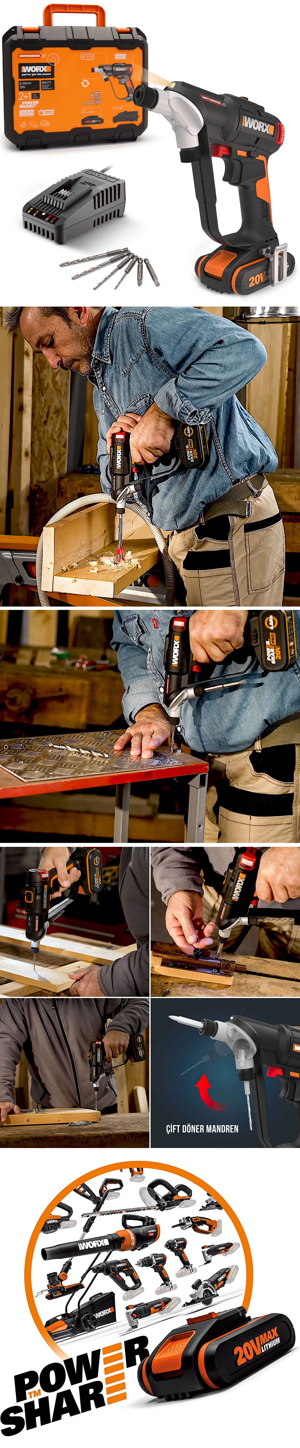 · WORX WX177 20Volt/2.0Ah Li-ion Döner Kafa ve Çift Mandrenli Profesyonel Kömürsüz Şarjlı Matkap + 6 Parça Uç