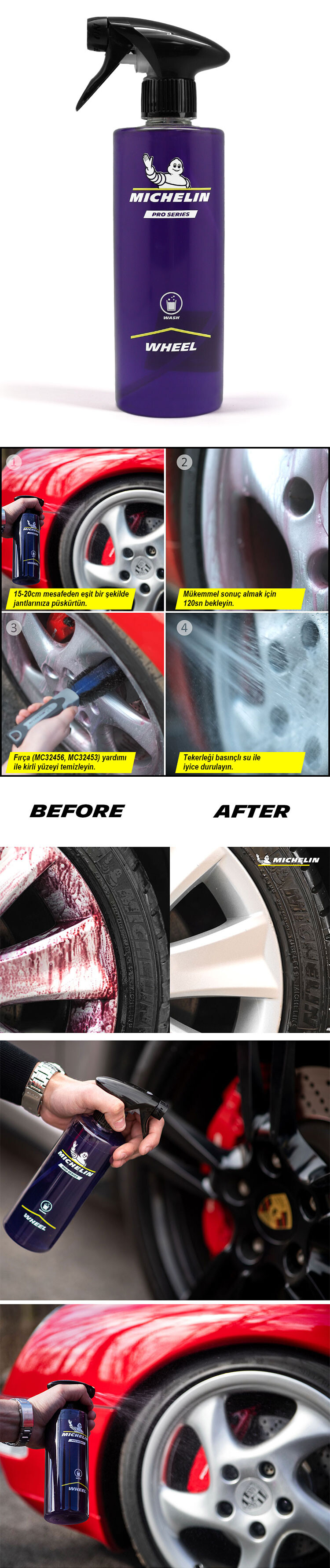 • Michelin Özel geliştirilmiş asit içermeyen formülü lastik, jant temizleyici sayesinde çelik alaşım, krom ve lake gibi tüm jant ve lastik türlerinde inatçı kirleri temizler, bakım yapar.