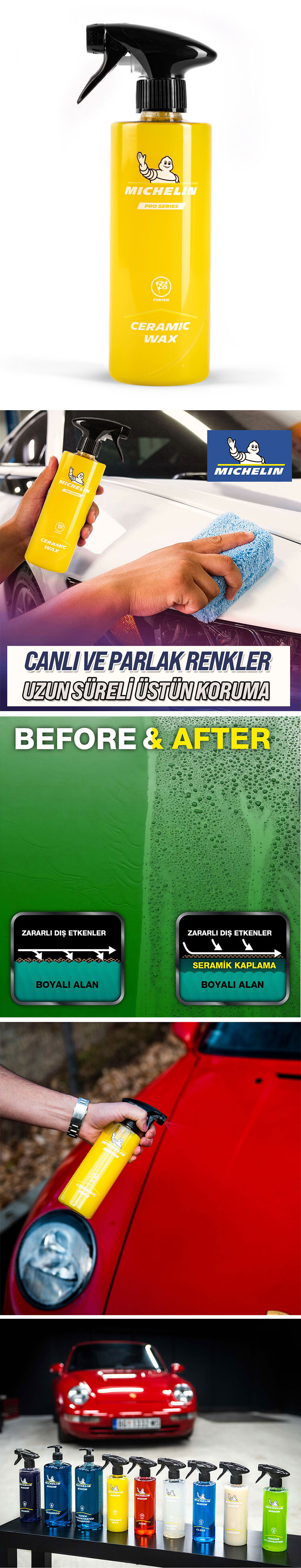 • 500ml Michelin özel Si02 Emprenye formülü ile geliştirilmiş seramik sprey cila sayesinde araç kaportaları, tampon, kapı kolları, çamurluk ve tüm dış boyalı yüzeylerin parlak görünmesini ve daha az kirlenmesini sağlamak için özel olarak geliştirilmiştir.
