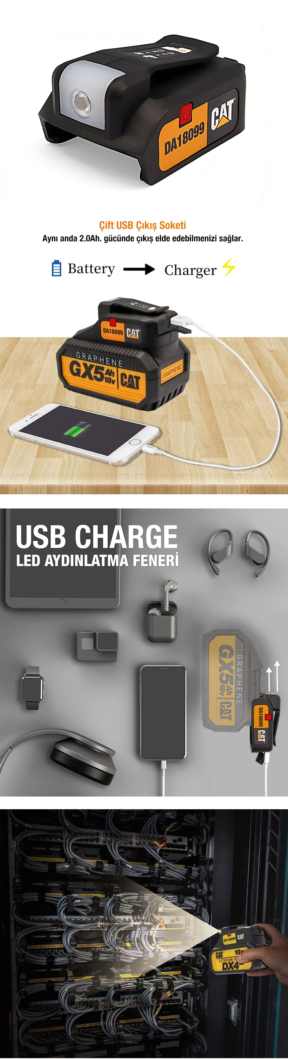 • CAT DA18099 18Volt 2A Çift Çıkışlı USB Port + LED Fener (Akü Dahil Değildir)