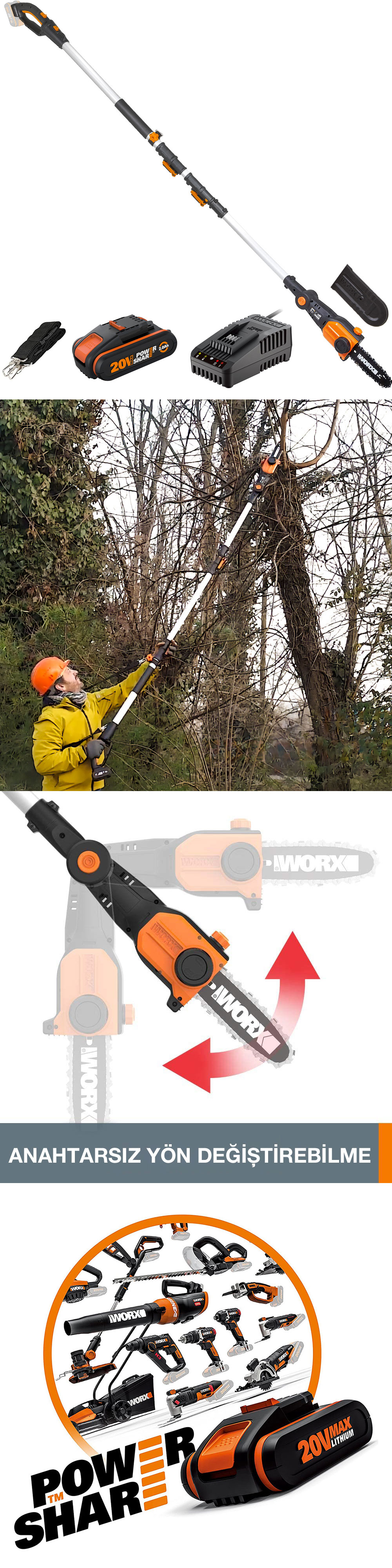 · WORX WG349E 20Volt 2.0Ah Li-ion Tek Akülü 20CM Profesyonel Teleskobik Saplı Açı Ayarlı Zincirli Dal Budama