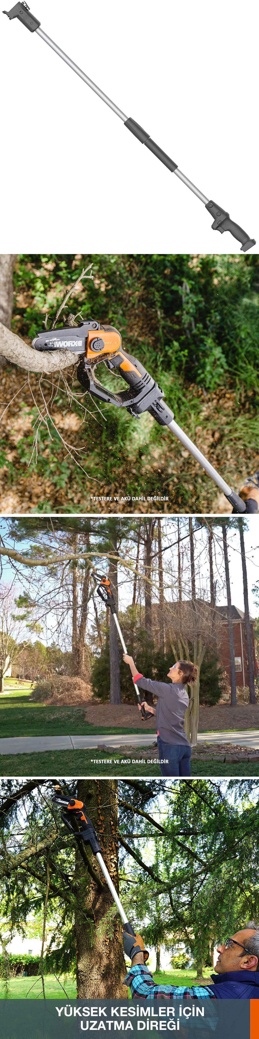 · İki bağlantı noktası ile toplam 125cm uzunluğa sahip sağlam Alüminyum şaft sayesinde WG324E 12cm zincirli testere ile uyumlu uzatma aparatı erişilmesi zor, yüksek ağaç dallarının budanmasında kolaylık sağlar.